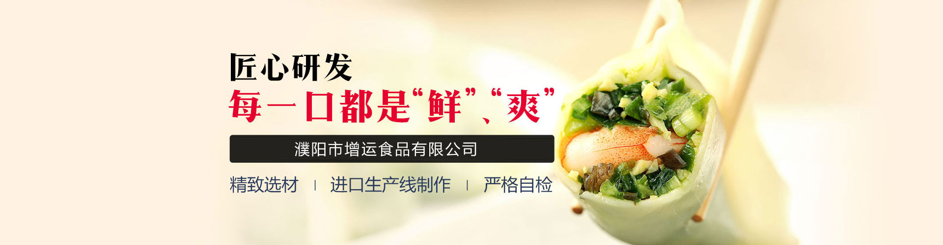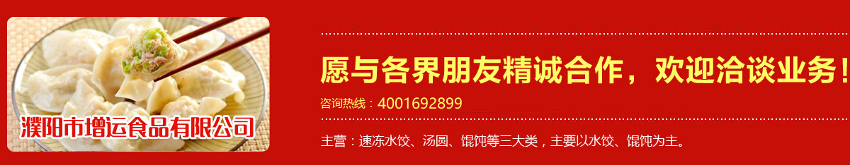 河南·濮陽增運食品有限公司位于龍的故鄉(xiāng)--濮陽,是一家生產(chǎn)速凍米面食品的專業(yè)公司,著力打造“增運”品牌,產(chǎn)品主要有速凍水餃、湯圓、餛飩等三大類,主要以水餃、餛飩為主。公司擁有兩個先進(jìn)加工車間,一個凍品加工車間,能滿足各種速凍產(chǎn)品的加工需求。
